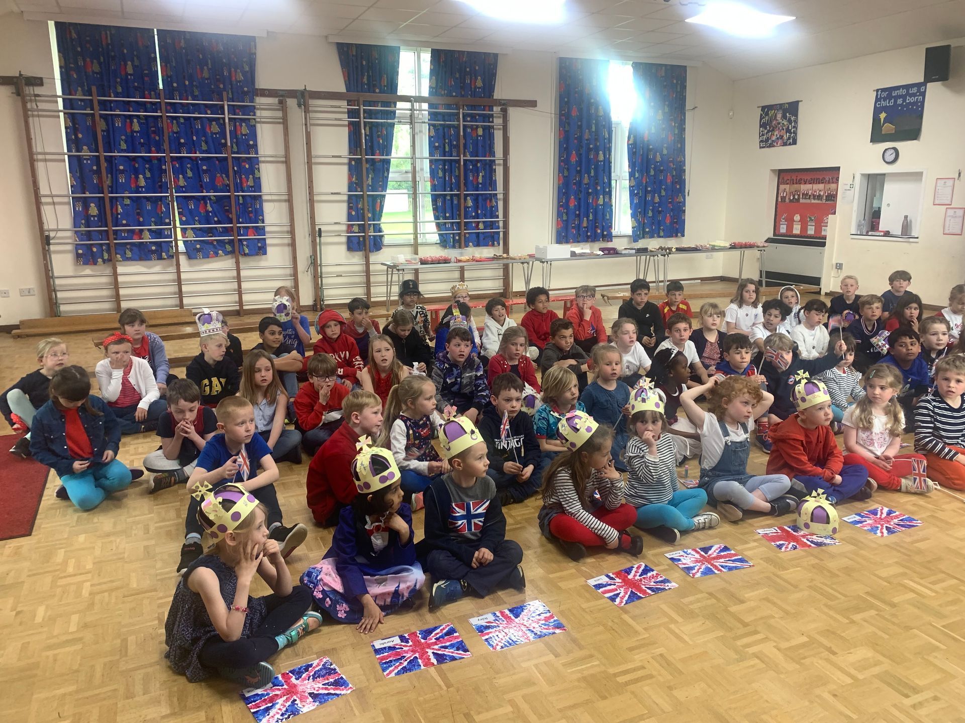 The Year 3 choir sang to open the school assembly under bunting made by pupils especially for the coronation celebrations.